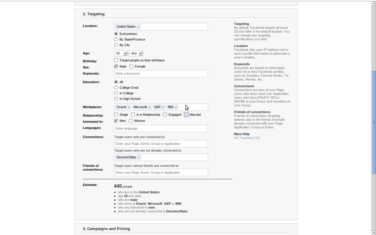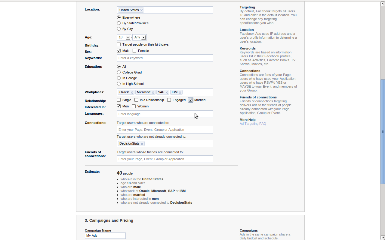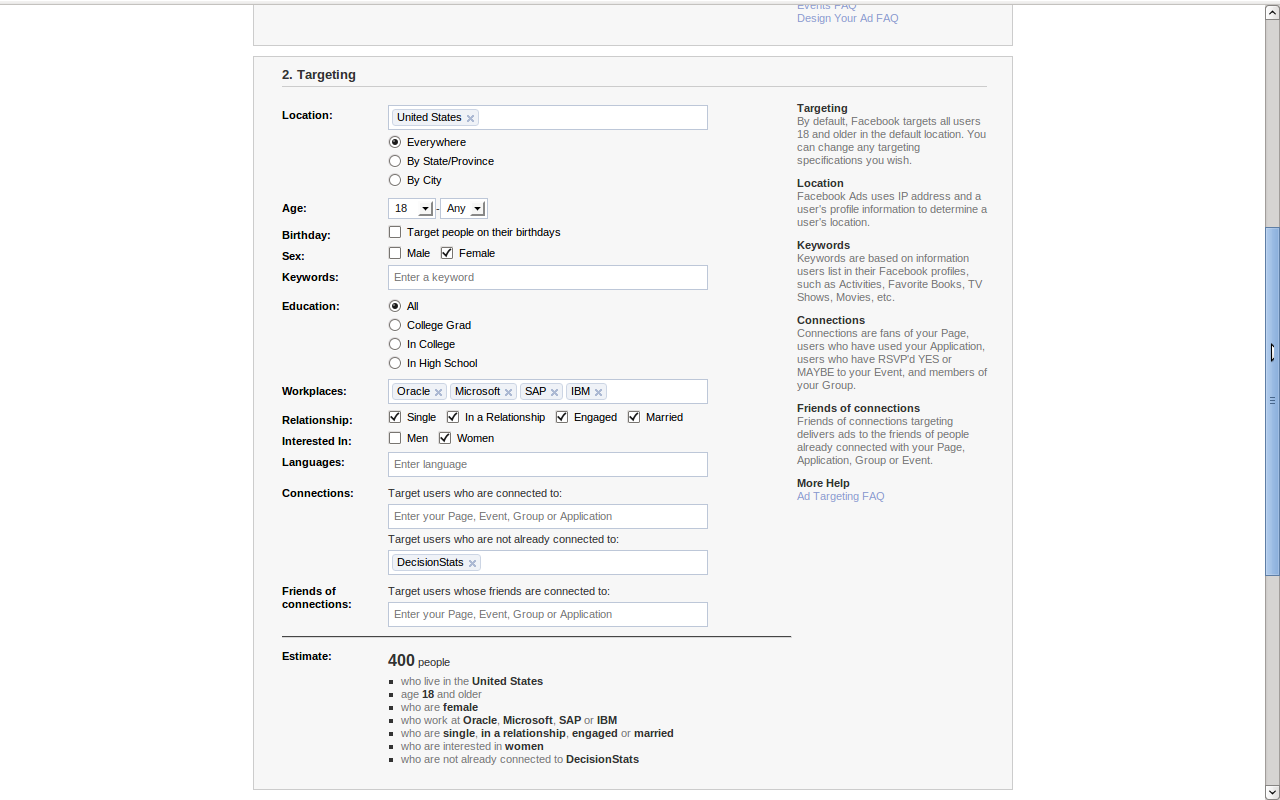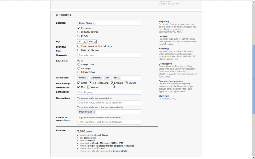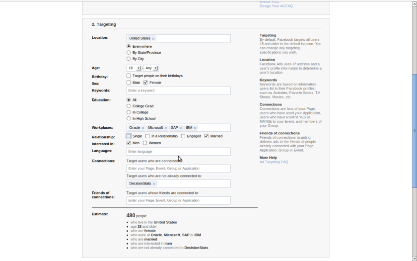 So you got a Facebook ID and ticked it in a hurry AND added in your work info. Bad Choice. Even small advertisers like me ( with 225 fans for Decisionstats) can see aggregate numbers of work info BEFORE even advertising.