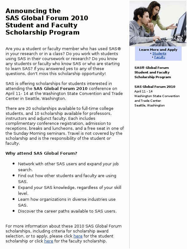 In a series of posts on forthcoming, first and foremost is the SAS Global Conference which is giving away 20 invites to Students and also seperately to Faculty. This conference is based in Seattle and is from April 11-14