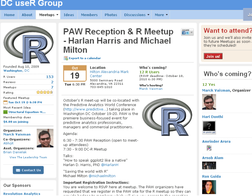 October’s R meet-up will be co-located with the Predictive Analytics World Conference (http://www.predictive…) taking place in Washington DC October 19-20. PAW is the premiere business-focused event for predictive analytics professionals, managers and commercial practitioners.