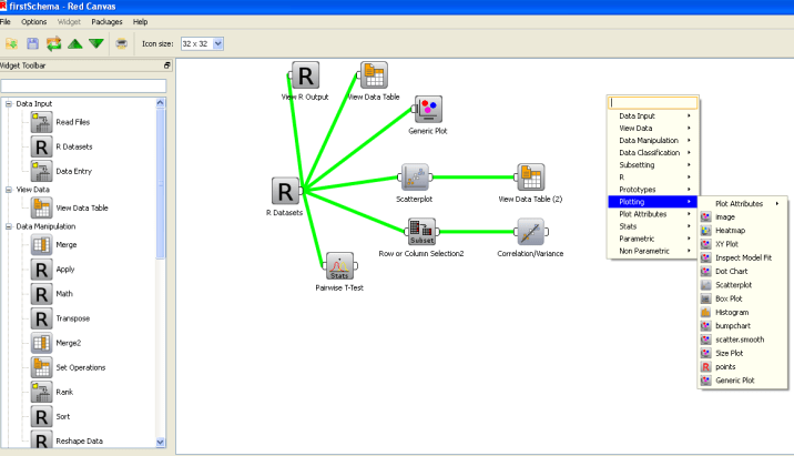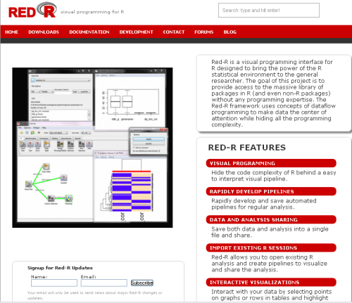 If you have seen Red R, well it resembles software like Enterprise Miner or Rapid Miner in the visual sense as it basically has a work-flow style of showing and setting up data analysis.