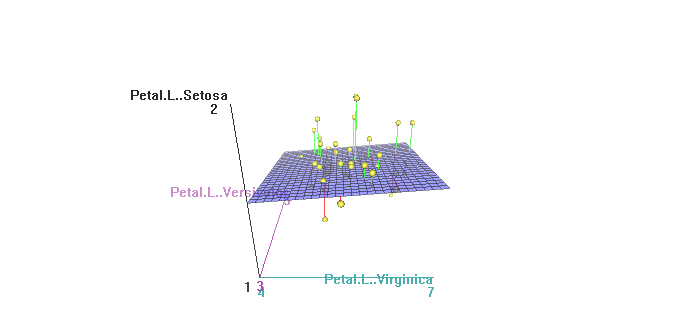 > scatter3d(iris3$Petal.L..Versicolor, iris3$Petal.L..Setosa, +   iris3$Petal.L..Virginica, fit="linear", residuals=TRUE, bg="white", +   axis.scales=TRUE, grid=TRUE, ellipsoid=FALSE, xlab="Petal.L..Versicolor", +   ylab="Petal.L..Setosa", zlab="Petal.L..Virginica")