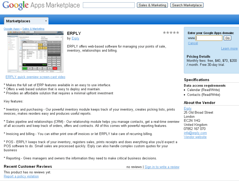 While not quite Salesforce.com, a promising start for the first ERP Google App at https://www.google.com/enterprise/marketplace/viewListing?productListingId=5759+8485502070963042532