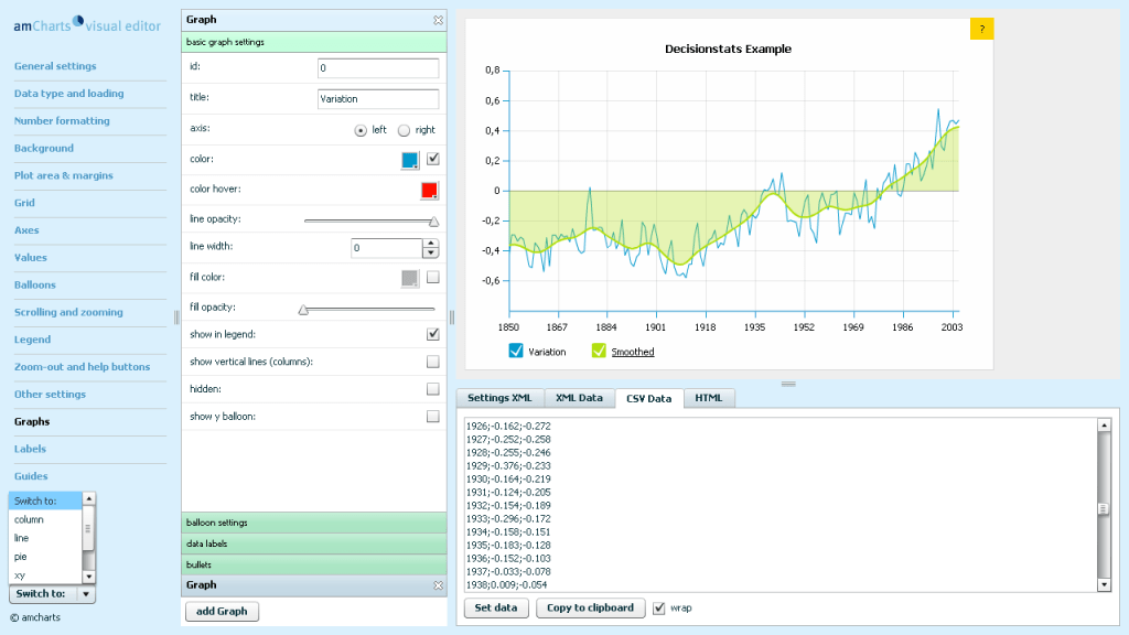 This is an example of a Line Chart. Note since I am on wordpress.com I cant use Javascript so have pasted the screenshot-All you can do is paste the data from csv file, and even the swf file is hosted on their servers.