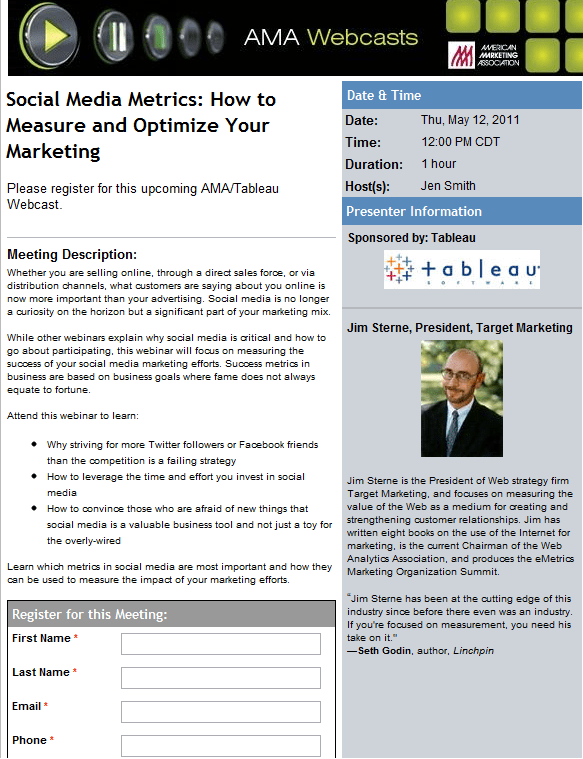 Jim Sterne is the President of Web strategy firm Target Marketing, and focuses on measuring the value of the Web as a medium for creating and strengthening customer relationships. Jim has written eight books on the use of the Internet for marketing, is the current Chairman of the Web Analytics Association, and produces the eMetrics Marketing Organization Summit.“Jim Sterne has been at the cutting edge of this industry since before there even was an industry. If you’re focused on measurement, you need his take on it.”