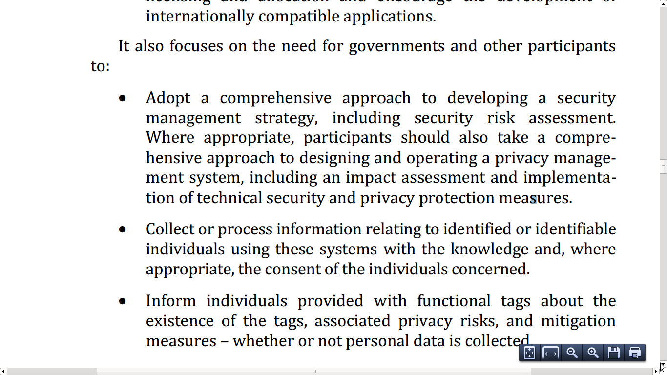The OECD Policy Guidance on Radio Frequency Identification (Annex C) encourages research on the economic and social impacts of such technologies The guidance points out the need to prevent and mitigate security risks and to address privacy concerns arising when information relating to an identified or identifiable individual is collected or processed.