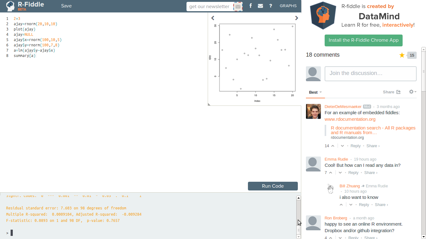 Rapporter is great for generating reports, but it is not very interactive – editing templates is a bit cumbersome if you just need to run a few commands. I think it wants to be the place to go to after you have finalized the development of the R code, so that you can share it. Right now, I also do not see the scalability.