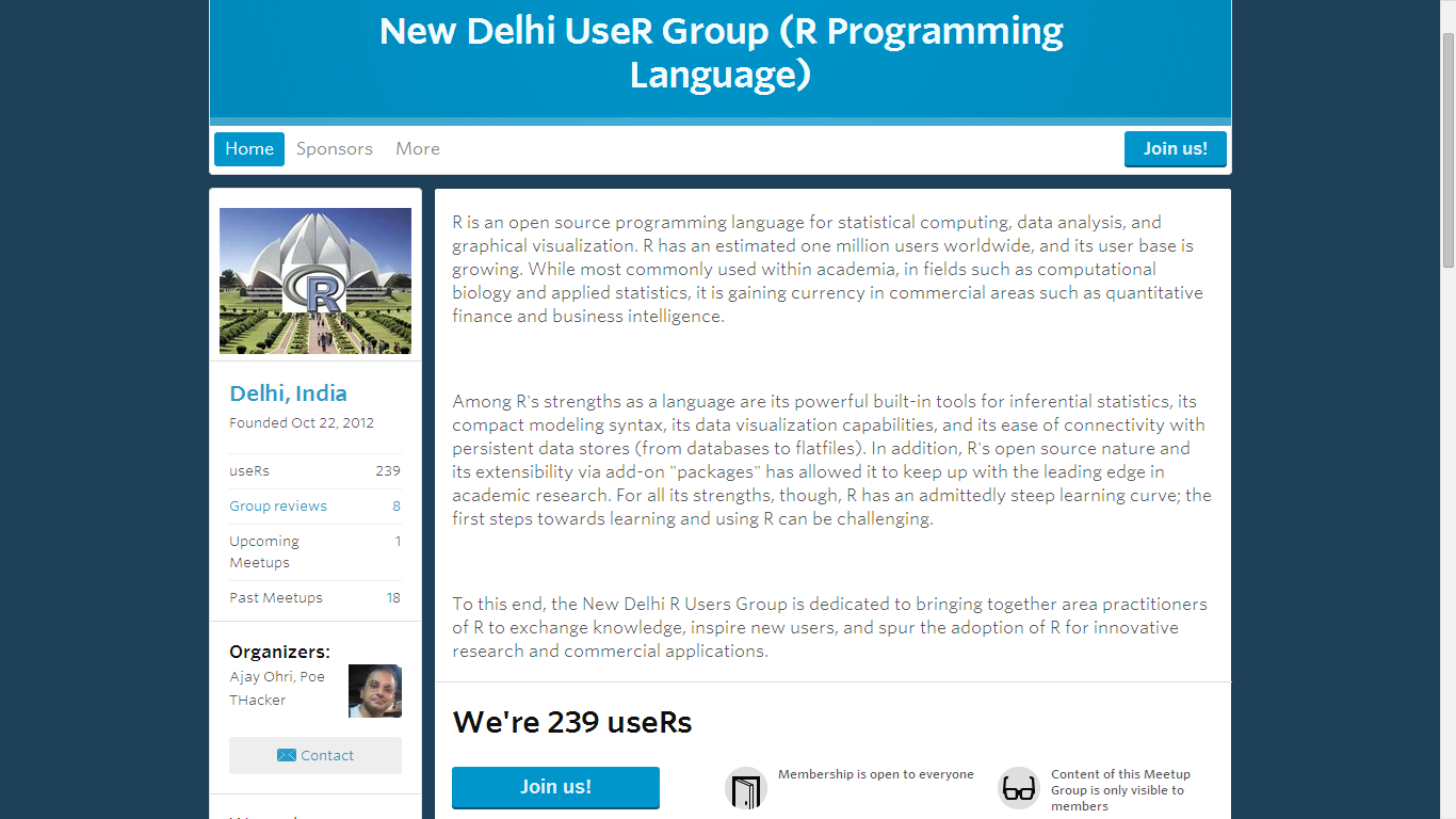 Overall with 239 Users, this is growing to be a critical and large piece in the traditionally outsourcing hub of NCR, India. With thousands of SAS license users and programmers in Gurgaon and Noida, we hope we can make a difference in promoting open source awareness.