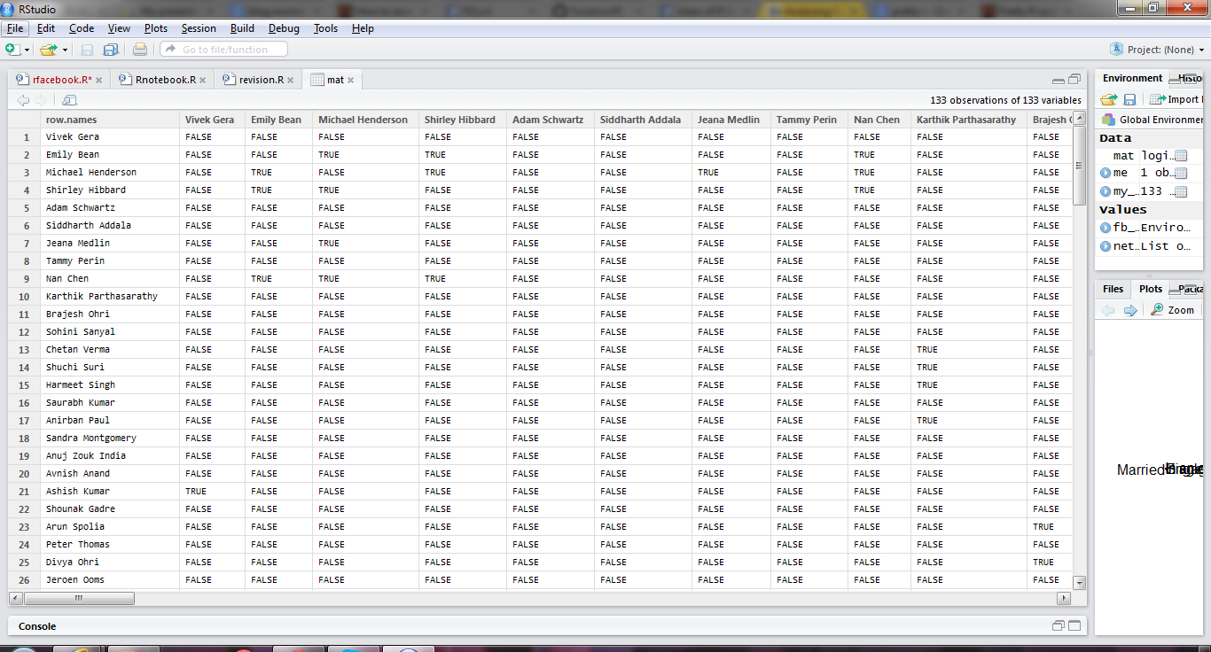 Note- this is what an adjancency matrix is- just a fancy word for turning your Fb friends into a 1-0 matrix based on their relationships. The more friends you have the more interesting this analysis