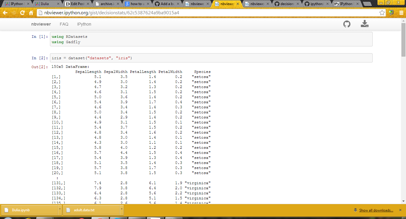 some packages to install IJulia, RDatasets, PyCall,PyPlot,Gadfly,Rif