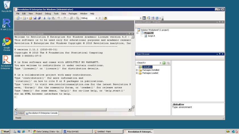 This looks like a new clean machine with just Windows OS installed on it. Install Chrome (or any other browser) if you do not use Internet Explorer Install Acrobat Reader (for documentation), Revolution R Enterprise~ 490 mb (it will automatically ask to install the .NET framework-4 files) and /or R