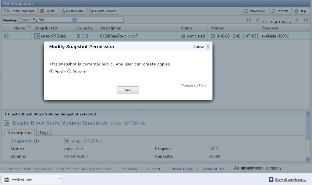 If you want to save your files for working later, you can make a snapshot (go to amazon console-ec2- left margin- ABS -Snapshot- you will see an attached memory (green light)- click on create snapshot to save your files for working later If you want to use my Windows snapshot you can work on it , just when you start your Amazon Ec2 you can click on snapshots and enter details (see snapshot name below) for making a copy or working on it for exploring either 64 bit R, or multi core cloud computing or just trying out Revolution R’s new packages for academic purposes.