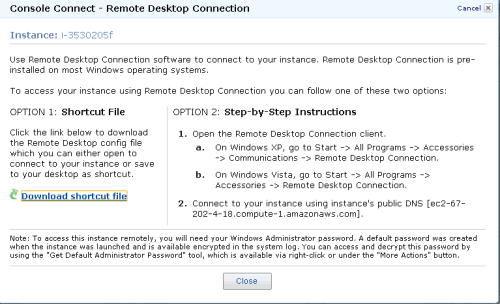 and see status (yellow for pending) Click on Instance Actions-Connect on Top Bar to see following Download the .RDP shortcut file and Click on Instance Actions-Request Admin Password