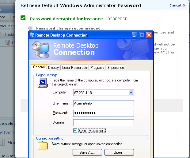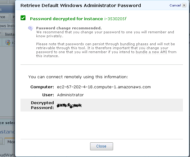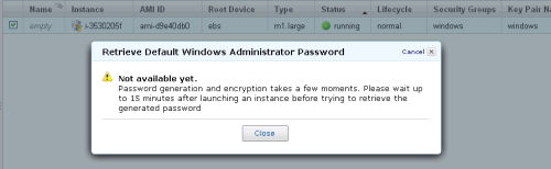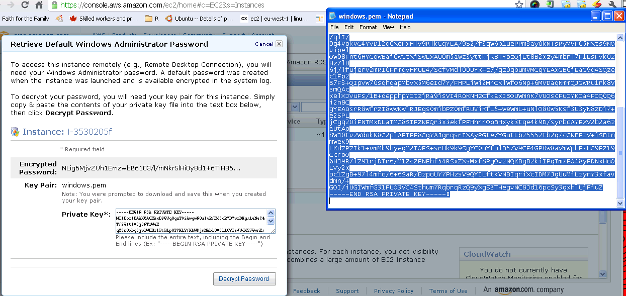 Wait 15 minutes while burning few cents for free as Microsoft creates a password for you Have coffee (or tea is you are health minded) Click Again on Instance Actions-Request Admin Password Open the key pair file (or .pem file created earlier) using