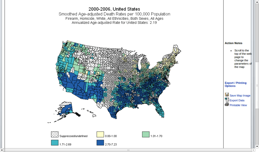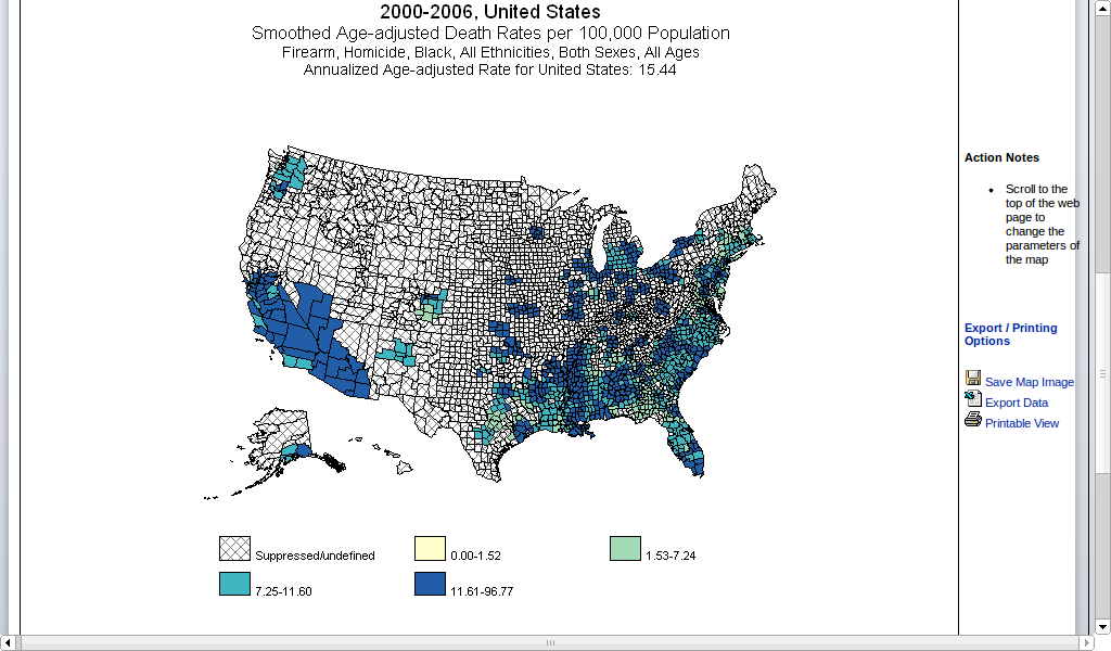 As a test I decided to map out injuries due to fire arms , and compare firearm deaths of white people versus the whole population.(see firearm deaths file)