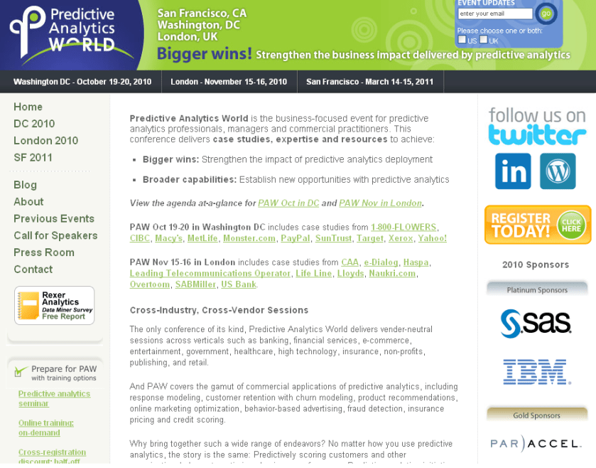 PAW’s DC 2010 (Oct 19-20) program includes over 25 sessions across two tracks – an “All Audiences” and an “Expert/Practitioner” track — so you can witness how predictive analytics is applied at 1-800-FLOWERS, CIBC, Corporate Executive Board, Forrester, LifeLine, Macy’s, MetLife, Miles Kimball, Monster, Paychex, PayPal (eBay), SunTrust, Target, UPMC Health Plan, Xerox, YMCA, and Yahoo!, plus special examples from the U.S. government agencies DoD, DHS, and SSA.