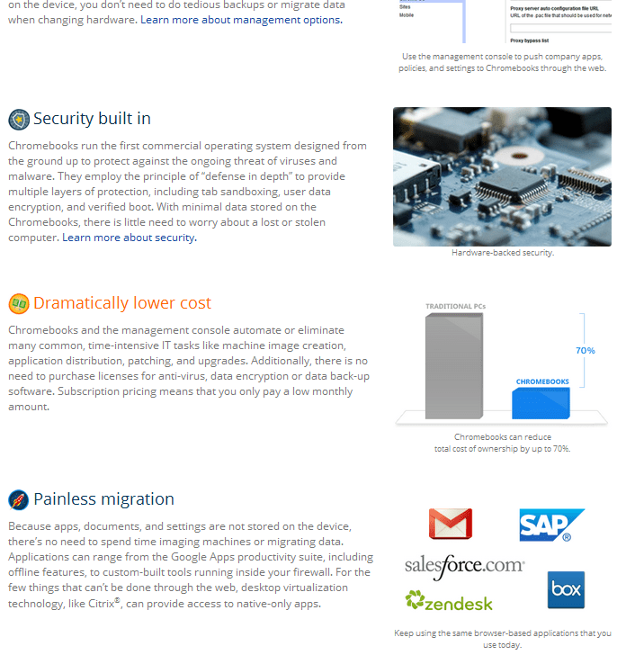 Even with dedicated IT departments, businesses and schools struggle with the same complex, costly and insecure computers as the rest of us. To address this, we’re also announcing Chromebooks for Business and Education.