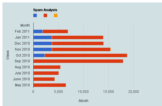 Here is a brief dataset I out after one hour of cutting and pasting from WordPress.com’s creative data style formats. It shows spam,comments,traffic, and number of posts written monthly.