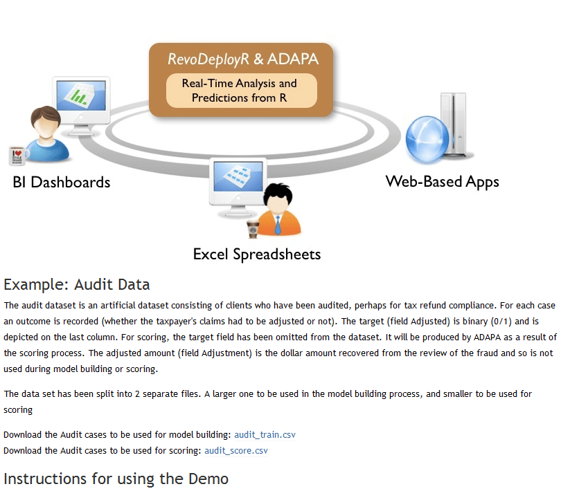 RevoDeployR & ADAPA allow for real-time analysis and predictions from R to be effectively used by existing Excel spreadsheets, BI dashboards and Web-based applications, all in real-time.