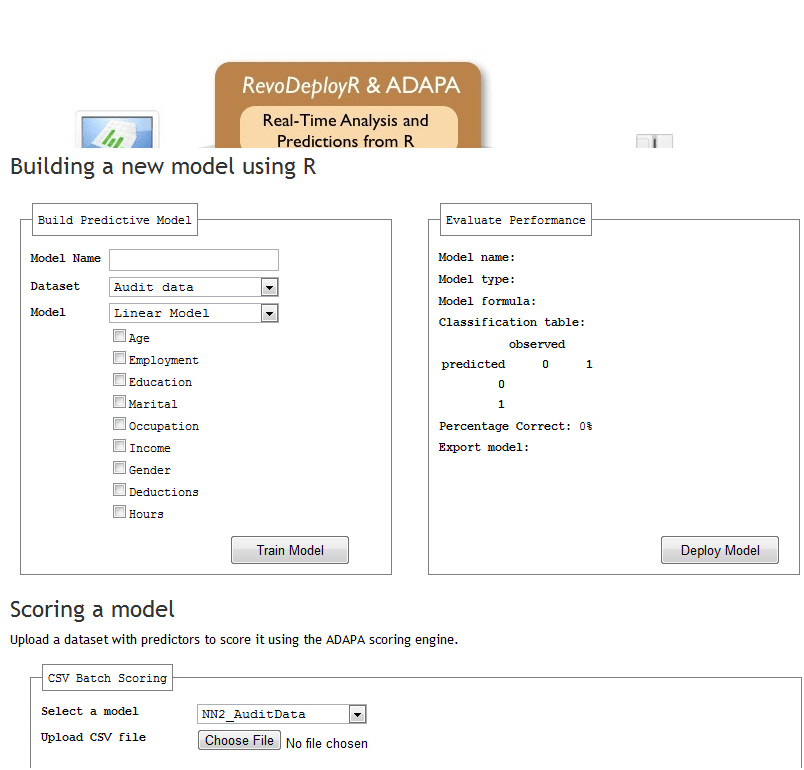 Once exported as PMML files, models are readily available for deployment into an execution engine for scoring or classification. ADAPA is one example of such an engine. It takes in models expressed in PMML and transforms them into web-services. Models can be executed either remotely by using web-services calls, or via a web console. Users can also use an Excel add-in to score data from inside Excel using models built in R.
